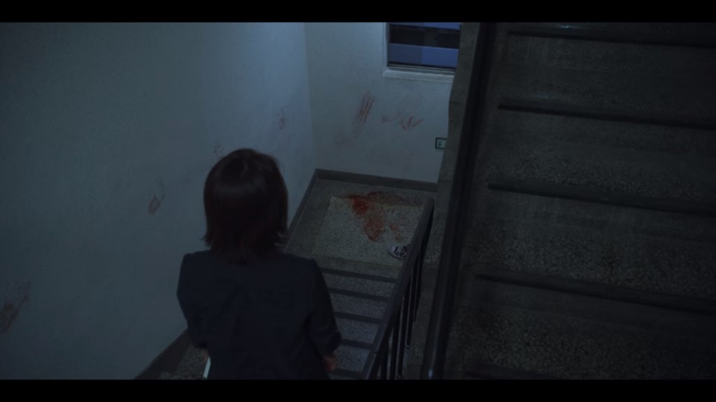 My thoughts? Ki Tae recovered from Gyu Ri’s blow and was the one Ji Soo saw standing at the top of the stairway. By the time Policewoman gets there, Gyu Ri and Ji Soo are already gone, but someone was at the top when Ji Soo looked up. It would also explain why Ki Tae isn’t in the apartment when the policewoman gets there: he already left the apartment, most likely finding the two since they left a trail of blood behind them.