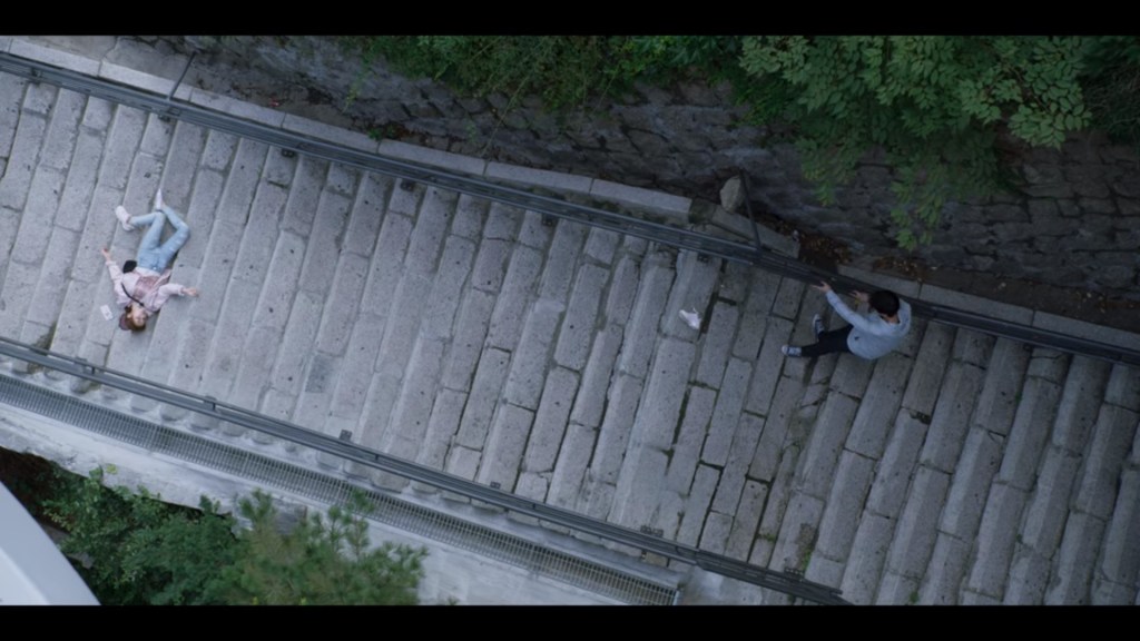 It all goes downhill when Min Hee does…or, rather, “downstairs.” Because that’s where she ends up, unmoving and bleeding from her head, after the two of them scuffle over Min Hee’s phone which recorded all of Ji Soo’s confession.