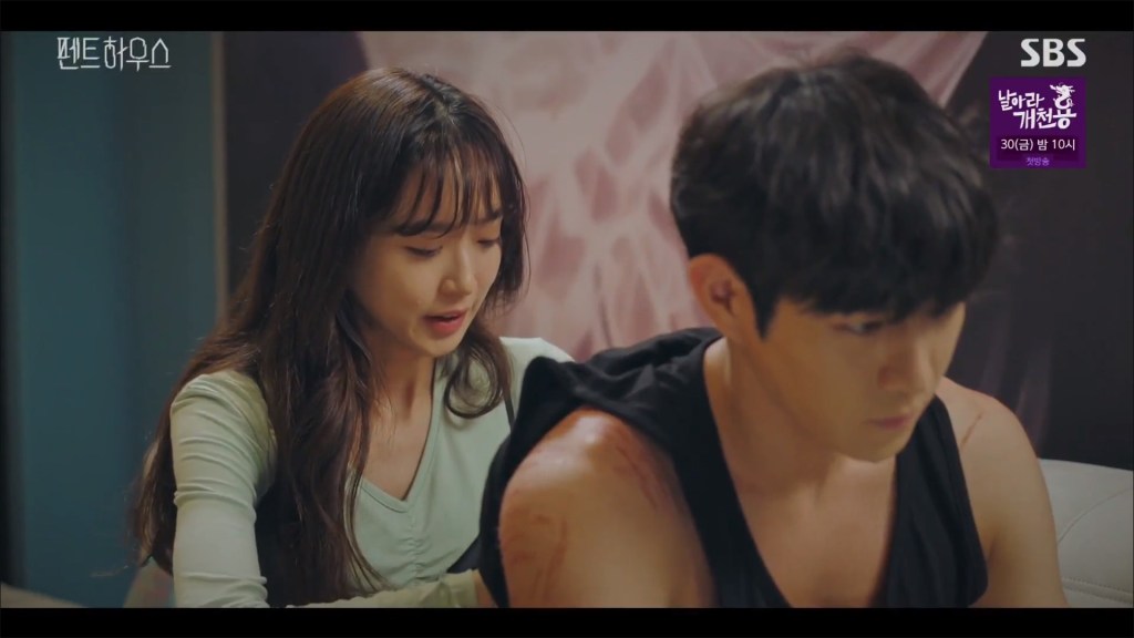 I really like Shim Su Ryeon (Lee Ji Ah), the stepmother of our above-mentioned twins. How she ended up with their sadistic father, I have no clue. (And she doesn’t even know the half of it.) Maybe we’ll find out how the two came together later on, but so far we’ve seen that he’s able to mask his true nature when he wants to…the key phrase here being “when he wants to.” (By the way, Uhm Ki Joon is tackling this difficult role — of father and husband Joo Dan Tae — with incredible dexterity and I’m so impressed with his acting ability. How he can look so tame and kind and yet be such a believably violent creep is absolutely terrifying.) Contrary to her husband, however, Su Ryeon is kind and caring. She also has a biological daughter in the mix who seemingly has been a vegetable in the hospital for 16 years. Su Ryeon is so far the only good one in all of our penthouse residents. It’s nice to know we have someone we can trust on the inside.