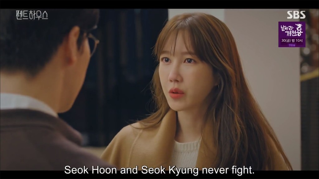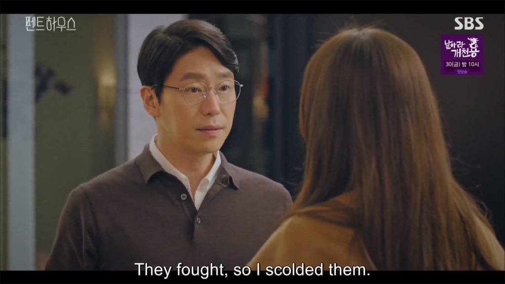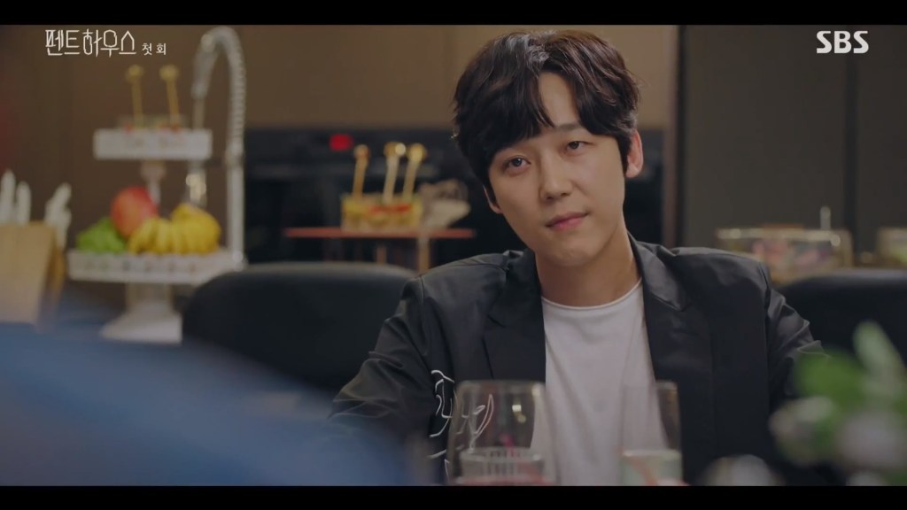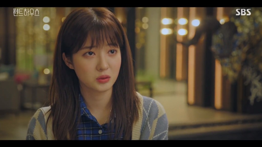 I can’t put my finger on why, but I don’t really like this character much so far. She seems extremely mousy and submissive at all the wrong times. At first I thought she’d be the type to stand up for herself, especially when she jousts verbally with the intimidating and quick-witted Seok Kyung. But Seol A’s really letting these nasty people walk all over her right now and I wish she wouldn’t. Of course, it could be that she’s biding her time until she reveals the hidden ace she has — the incriminating video she took of two married (to other people) members of the penthouse kissing passionately.